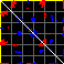 This matrix displays the maximum distance fluctuations between all pairs of CA atoms and between the two extreme conformations that were computed for this mode (DQMIN/DQMAX). Distance increases are plotted in blue and decreases in red for the strongest 10% of the residue pair distance changes. Every pixel corresponds to a single residue. Grey lines are drawn every 10 residues, yellow lines every 100 residues (counting from the upper left corner).