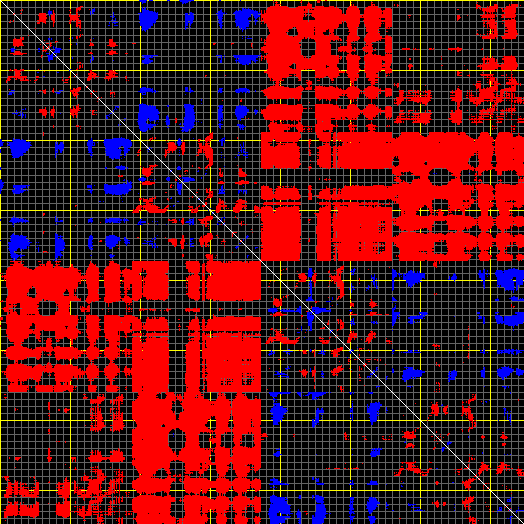 This matrix displays the maximum distance fluctuations between all pairs of CA atoms and between the two extreme conformations that were computed for this mode (DQMIN/DQMAX). Distance increases are plotted in blue and decreases in red for the strongest 10% of the residue pair distance changes. Every pixel corresponds to a single residue. Grey lines are drawn every 10 residues, yellow lines every 100 residues (counting from the upper left corner).