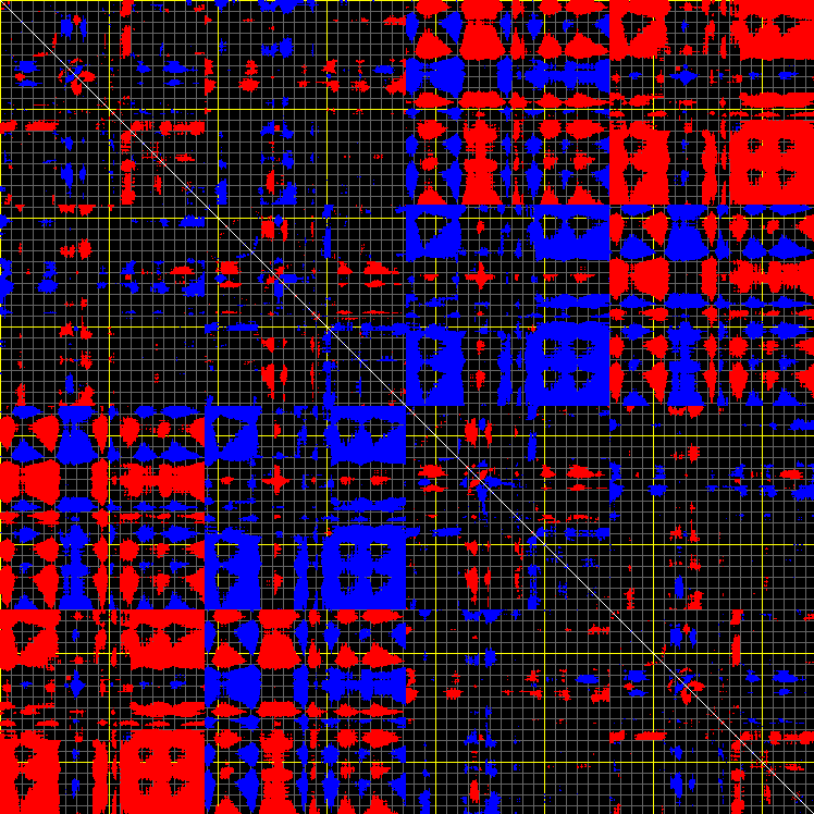 This matrix displays the maximum distance fluctuations between all pairs of CA atoms and between the two extreme conformations that were computed for this mode (DQMIN/DQMAX). Distance increases are plotted in blue and decreases in red for the strongest 10% of the residue pair distance changes. Every pixel corresponds to a single residue. Grey lines are drawn every 10 residues, yellow lines every 100 residues (counting from the upper left corner).