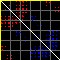 This matrix displays the maximum distance fluctuations between all pairs of CA atoms and between the two extreme conformations that were computed for this mode (DQMIN/DQMAX). Distance increases are plotted in blue and decreases in red for the strongest 10% of the residue pair distance changes. Every pixel corresponds to a single residue. Grey lines are drawn every 10 residues, yellow lines every 100 residues (counting from the upper left corner).