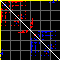 This matrix displays the maximum distance fluctuations between all pairs of CA atoms and between the two extreme conformations that were computed for this mode (DQMIN/DQMAX). Distance increases are plotted in blue and decreases in red for the strongest 10% of the residue pair distance changes. Every pixel corresponds to a single residue. Grey lines are drawn every 10 residues, yellow lines every 100 residues (counting from the upper left corner).