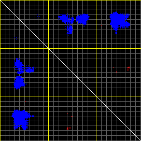This matrix displays the maximum distance fluctuations between all pairs of CA atoms and between the two extreme conformations that were computed for this mode (DQMIN/DQMAX). Distance increases are plotted in blue and decreases in red for the strongest 10% of the residue pair distance changes. Every pixel corresponds to a single residue. Grey lines are drawn every 10 residues, yellow lines every 100 residues (counting from the upper left corner).