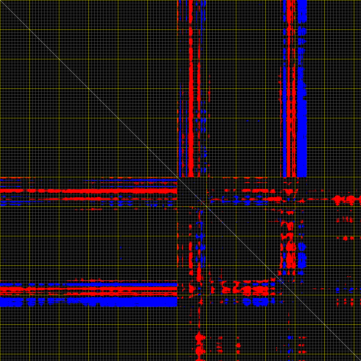 This matrix displays the maximum distance fluctuations between all pairs of CA atoms and between the two extreme conformations that were computed for this mode (DQMIN/DQMAX). Distance increases are plotted in blue and decreases in red for the strongest 10% of the residue pair distance changes. Every pixel corresponds to a single residue. Grey lines are drawn every 10 residues, yellow lines every 100 residues (counting from the upper left corner).
