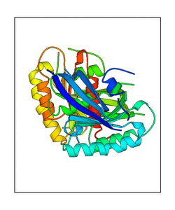 These views are prepared from three orthologuous viewpoints with MolScript. Secondary structures are determined from the C-alpha atom positions of your protein (N-terminal blue, C-terminal red).