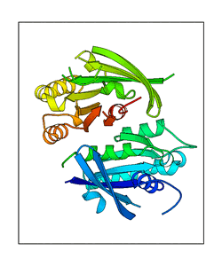 These views are prepared from three orthologuous viewpoints with MolScript. Secondary structures are determined from the C-alpha atom positions of your protein (N-terminal blue, C-terminal red).
