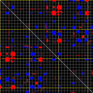 This matrix displays the maximum distance fluctuations between all pairs of CA atoms and between the two extreme conformations that were computed for this mode (DQMIN/DQMAX). Distance increases are plotted in blue and decreases in red for the strongest 10% of the residue pair distance changes. Every pixel corresponds to a single residue. Grey lines are drawn every 10 residues, yellow lines every 100 residues (counting from the upper left corner).