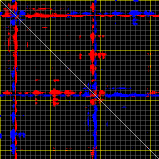 This matrix displays the maximum distance fluctuations between all pairs of CA atoms and between the two extreme conformations that were computed for this mode (DQMIN/DQMAX). Distance increases are plotted in blue and decreases in red for the strongest 10% of the residue pair distance changes. Every pixel corresponds to a single residue. Grey lines are drawn every 10 residues, yellow lines every 100 residues (counting from the upper left corner).