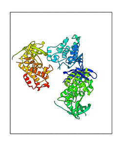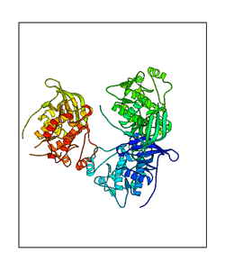 These views are prepared from three orthologuous viewpoints with MolScript. Secondary structures are determined from the C-alpha atom positions of your protein (N-terminal blue, C-terminal red).