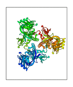 These views are prepared from three orthologuous viewpoints with MolScript. Secondary structures are determined from the C-alpha atom positions of your protein (N-terminal blue, C-terminal red).