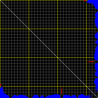 This matrix displays the maximum distance fluctuations between all pairs of CA atoms and between the two extreme conformations that were computed for this mode (DQMIN/DQMAX). Distance increases are plotted in blue and decreases in red for the strongest 10% of the residue pair distance changes. Every pixel corresponds to a single residue. Grey lines are drawn every 10 residues, yellow lines every 100 residues (counting from the upper left corner).