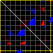 This matrix displays the maximum distance fluctuations between all pairs of CA atoms and between the two extreme conformations that were computed for this mode (DQMIN/DQMAX). Distance increases are plotted in blue and decreases in red for the strongest 10% of the residue pair distance changes. Every pixel corresponds to a single residue. Grey lines are drawn every 10 residues, yellow lines every 100 residues (counting from the upper left corner).