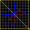 This matrix displays the maximum distance fluctuations between all pairs of CA atoms and between the two extreme conformations that were computed for this mode (DQMIN/DQMAX). Distance increases are plotted in blue and decreases in red for the strongest 10% of the residue pair distance changes. Every pixel corresponds to a single residue. Grey lines are drawn every 10 residues, yellow lines every 100 residues (counting from the upper left corner).