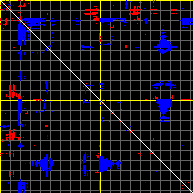 This matrix displays the maximum distance fluctuations between all pairs of CA atoms and between the two extreme conformations that were computed for this mode (DQMIN/DQMAX). Distance increases are plotted in blue and decreases in red for the strongest 10% of the residue pair distance changes. Every pixel corresponds to a single residue. Grey lines are drawn every 10 residues, yellow lines every 100 residues (counting from the upper left corner).