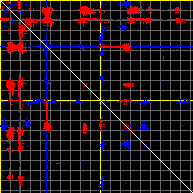 This matrix displays the maximum distance fluctuations between all pairs of CA atoms and between the two extreme conformations that were computed for this mode (DQMIN/DQMAX). Distance increases are plotted in blue and decreases in red for the strongest 10% of the residue pair distance changes. Every pixel corresponds to a single residue. Grey lines are drawn every 10 residues, yellow lines every 100 residues (counting from the upper left corner).