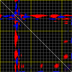This matrix displays the maximum distance fluctuations between all pairs of CA atoms and between the two extreme conformations that were computed for this mode (DQMIN/DQMAX). Distance increases are plotted in blue and decreases in red for the strongest 10% of the residue pair distance changes. Every pixel corresponds to a single residue. Grey lines are drawn every 10 residues, yellow lines every 100 residues (counting from the upper left corner).