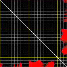 This matrix displays the maximum distance fluctuations between all pairs of CA atoms and between the two extreme conformations that were computed for this mode (DQMIN/DQMAX). Distance increases are plotted in blue and decreases in red for the strongest 10% of the residue pair distance changes. Every pixel corresponds to a single residue. Grey lines are drawn every 10 residues, yellow lines every 100 residues (counting from the upper left corner).