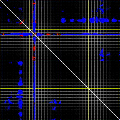 This matrix displays the maximum distance fluctuations between all pairs of CA atoms and between the two extreme conformations that were computed for this mode (DQMIN/DQMAX). Distance increases are plotted in blue and decreases in red for the strongest 10% of the residue pair distance changes. Every pixel corresponds to a single residue. Grey lines are drawn every 10 residues, yellow lines every 100 residues (counting from the upper left corner).