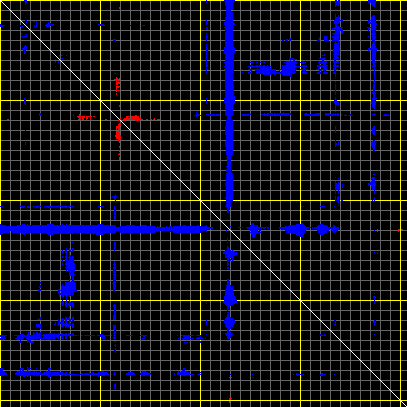 This matrix displays the maximum distance fluctuations between all pairs of CA atoms and between the two extreme conformations that were computed for this mode (DQMIN/DQMAX). Distance increases are plotted in blue and decreases in red for the strongest 10% of the residue pair distance changes. Every pixel corresponds to a single residue. Grey lines are drawn every 10 residues, yellow lines every 100 residues (counting from the upper left corner).