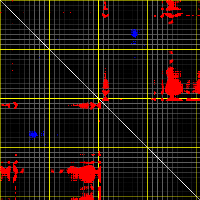 This matrix displays the maximum distance fluctuations between all pairs of CA atoms and between the two extreme conformations that were computed for this mode (DQMIN/DQMAX). Distance increases are plotted in blue and decreases in red for the strongest 10% of the residue pair distance changes. Every pixel corresponds to a single residue. Grey lines are drawn every 10 residues, yellow lines every 100 residues (counting from the upper left corner).