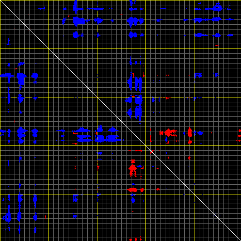 This matrix displays the maximum distance fluctuations between all pairs of CA atoms and between the two extreme conformations that were computed for this mode (DQMIN/DQMAX). Distance increases are plotted in blue and decreases in red for the strongest 10% of the residue pair distance changes. Every pixel corresponds to a single residue. Grey lines are drawn every 10 residues, yellow lines every 100 residues (counting from the upper left corner).