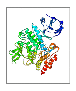 These views are prepared from three orthologuous viewpoints with MolScript. Secondary structures are determined from the C-alpha atom positions of your protein (N-terminal blue, C-terminal red).