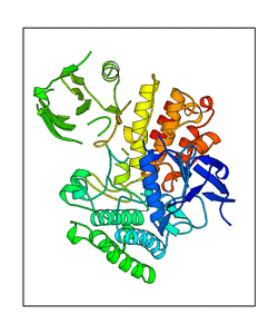 These views are prepared from three orthologuous viewpoints with MolScript. Secondary structures are determined from the C-alpha atom positions of your protein (N-terminal blue, C-terminal red).