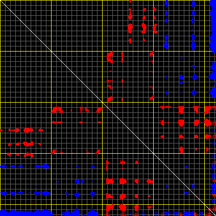 This matrix displays the maximum distance fluctuations between all pairs of CA atoms and between the two extreme conformations that were computed for this mode (DQMIN/DQMAX). Distance increases are plotted in blue and decreases in red for the strongest 10% of the residue pair distance changes. Every pixel corresponds to a single residue. Grey lines are drawn every 10 residues, yellow lines every 100 residues (counting from the upper left corner).