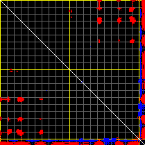 This matrix displays the maximum distance fluctuations between all pairs of CA atoms and between the two extreme conformations that were computed for this mode (DQMIN/DQMAX). Distance increases are plotted in blue and decreases in red for the strongest 10% of the residue pair distance changes. Every pixel corresponds to a single residue. Grey lines are drawn every 10 residues, yellow lines every 100 residues (counting from the upper left corner).