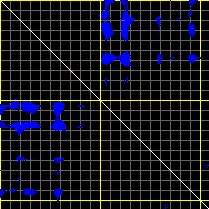 This matrix displays the maximum distance fluctuations between all pairs of CA atoms and between the two extreme conformations that were computed for this mode (DQMIN/DQMAX). Distance increases are plotted in blue and decreases in red for the strongest 10% of the residue pair distance changes. Every pixel corresponds to a single residue. Grey lines are drawn every 10 residues, yellow lines every 100 residues (counting from the upper left corner).