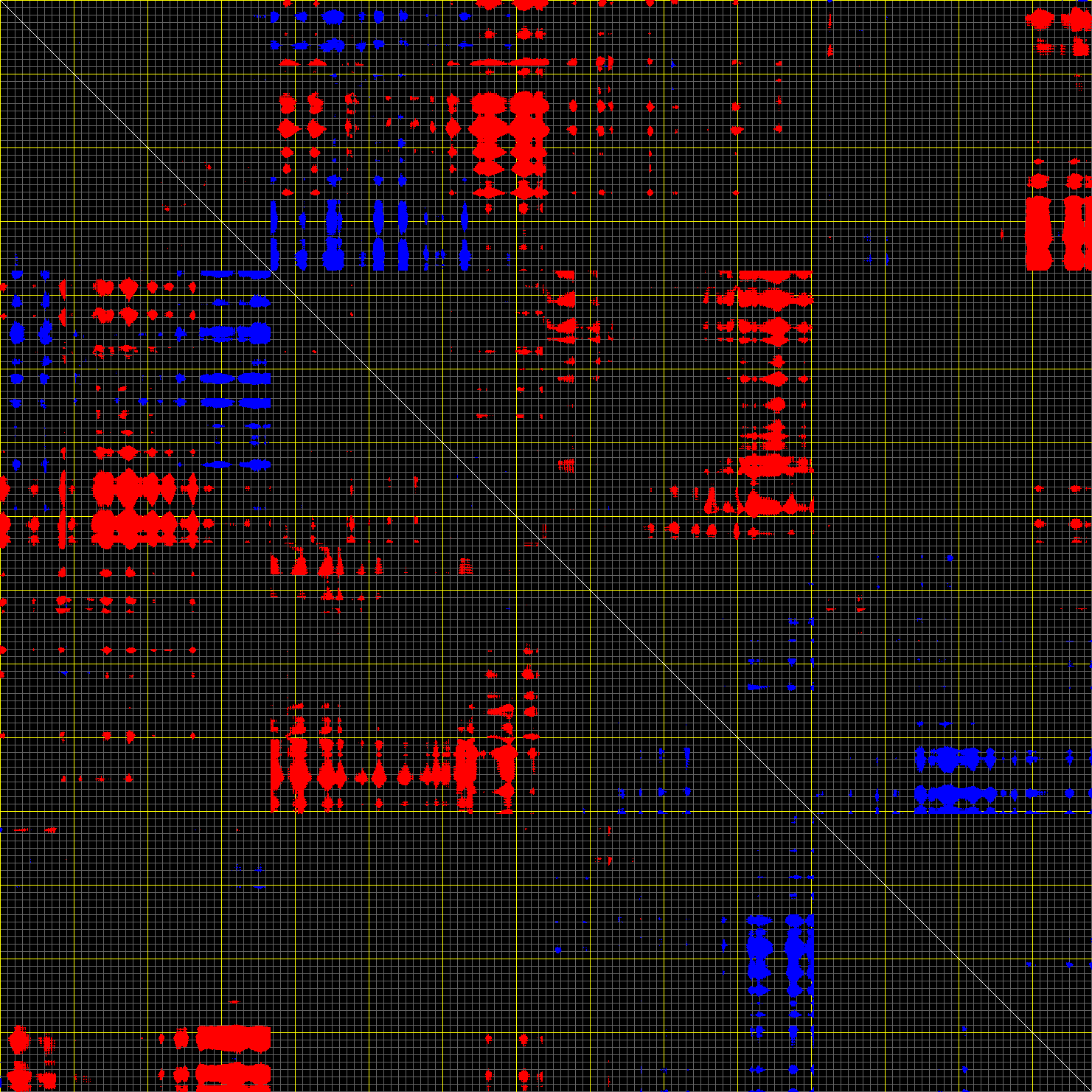 This matrix displays the maximum distance fluctuations between all pairs of CA atoms and between the two extreme conformations that were computed for this mode (DQMIN/DQMAX). Distance increases are plotted in blue and decreases in red for the strongest 10% of the residue pair distance changes. Every pixel corresponds to a single residue. Grey lines are drawn every 10 residues, yellow lines every 100 residues (counting from the upper left corner).