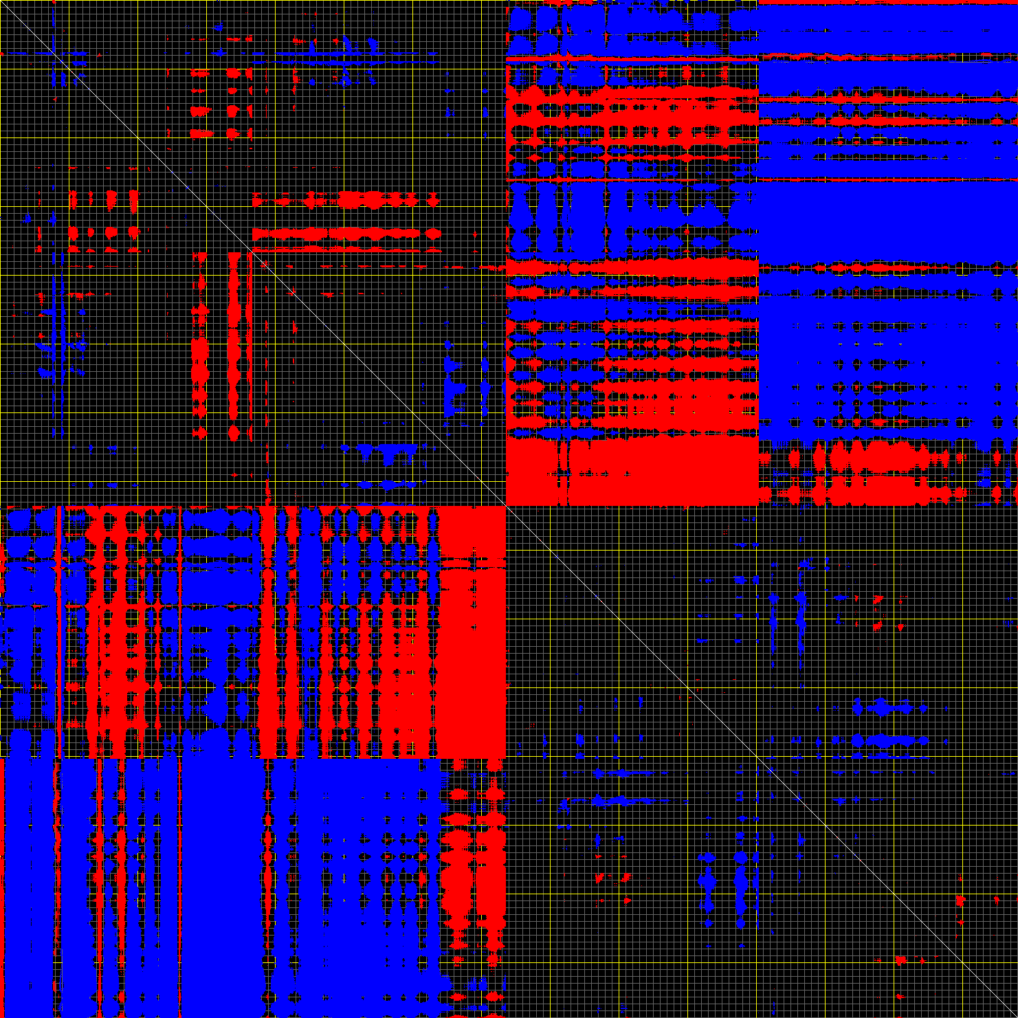 This matrix displays the maximum distance fluctuations between all pairs of CA atoms and between the two extreme conformations that were computed for this mode (DQMIN/DQMAX). Distance increases are plotted in blue and decreases in red for the strongest 10% of the residue pair distance changes. Every pixel corresponds to a single residue. Grey lines are drawn every 10 residues, yellow lines every 100 residues (counting from the upper left corner).