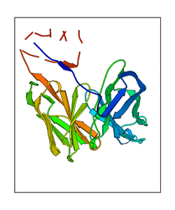 These views are prepared from three orthologuous viewpoints with MolScript. Secondary structures are determined from the C-alpha atom positions of your protein (N-terminal blue, C-terminal red).