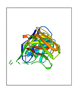 CAUTION: The amplitude range presented in these views corresponds to the highest (DQMAX) and lowest (DQMIN) perturbations chosen for this mode. Secondary structures can break down (and thus disappear from the animation) if the applied amplitudes are too large for Molscript to identify them. The choice of the amplitude is not a NMA result, but has to be done by the user on physical grounds. To change the amplitude range, you can recompute the animation of the desired mode by using the "Compute additional perturbed models with elNémo" section on the results page of your job.