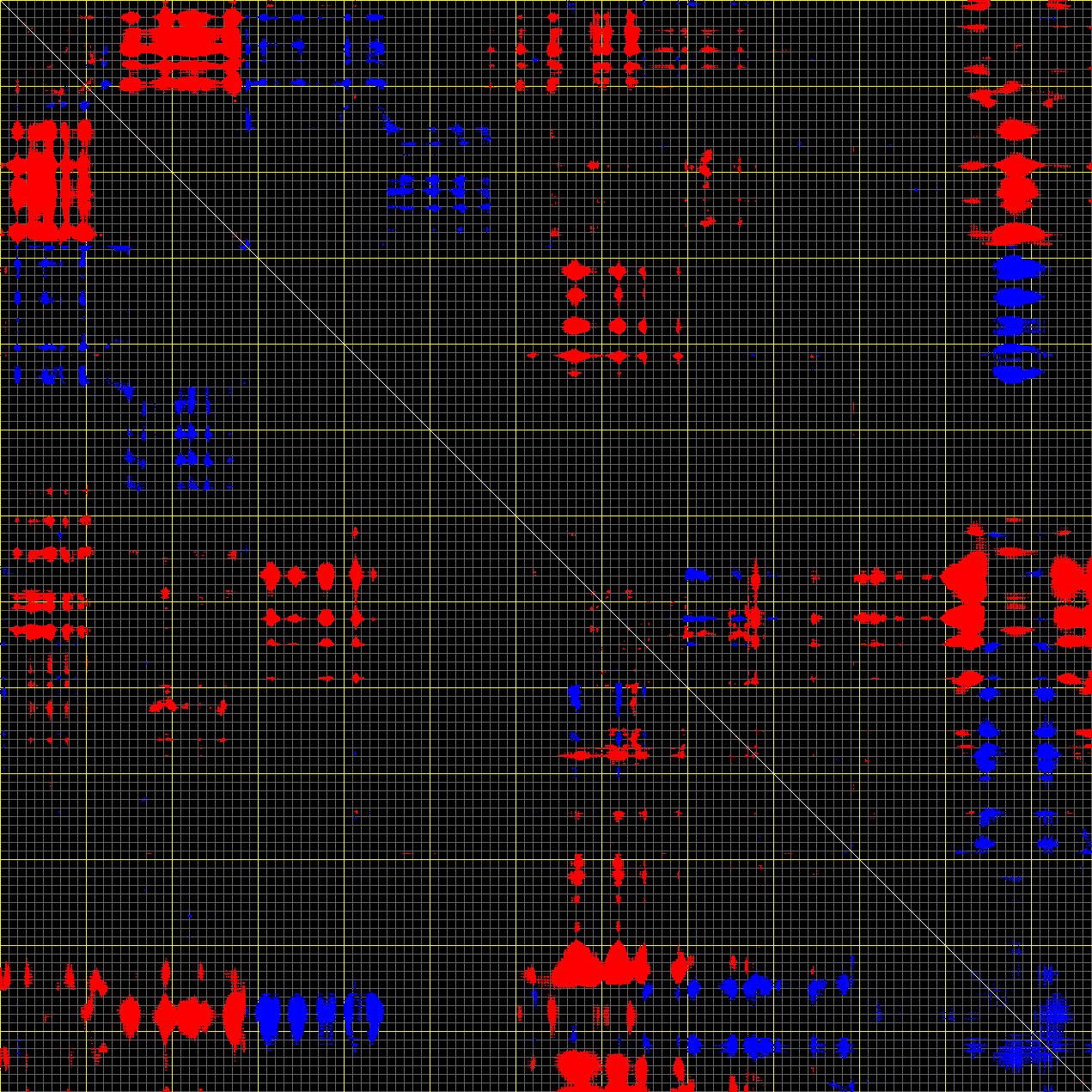 This matrix displays the maximum distance fluctuations between all pairs of CA atoms and between the two extreme conformations that were computed for this mode (DQMIN/DQMAX). Distance increases are plotted in blue and decreases in red for the strongest 10% of the residue pair distance changes. Every pixel corresponds to a single residue. Grey lines are drawn every 10 residues, yellow lines every 100 residues (counting from the upper left corner).