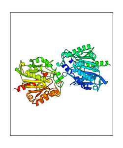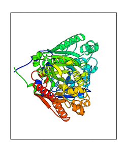 These views are prepared from three orthologuous viewpoints with MolScript. Secondary structures are determined from the C-alpha atom positions of your protein (N-terminal blue, C-terminal red).
