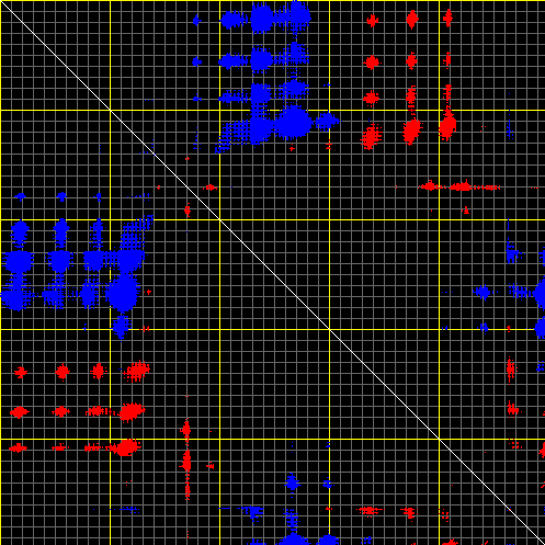 This matrix displays the maximum distance fluctuations between all pairs of CA atoms and between the two extreme conformations that were computed for this mode (DQMIN/DQMAX). Distance increases are plotted in blue and decreases in red for the strongest 10% of the residue pair distance changes. Every pixel corresponds to a single residue. Grey lines are drawn every 10 residues, yellow lines every 100 residues (counting from the upper left corner).