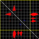This matrix displays the maximum distance fluctuations between all pairs of CA atoms and between the two extreme conformations that were computed for this mode (DQMIN/DQMAX). Distance increases are plotted in blue and decreases in red for the strongest 10% of the residue pair distance changes. Every pixel corresponds to a single residue. Grey lines are drawn every 10 residues, yellow lines every 100 residues (counting from the upper left corner).