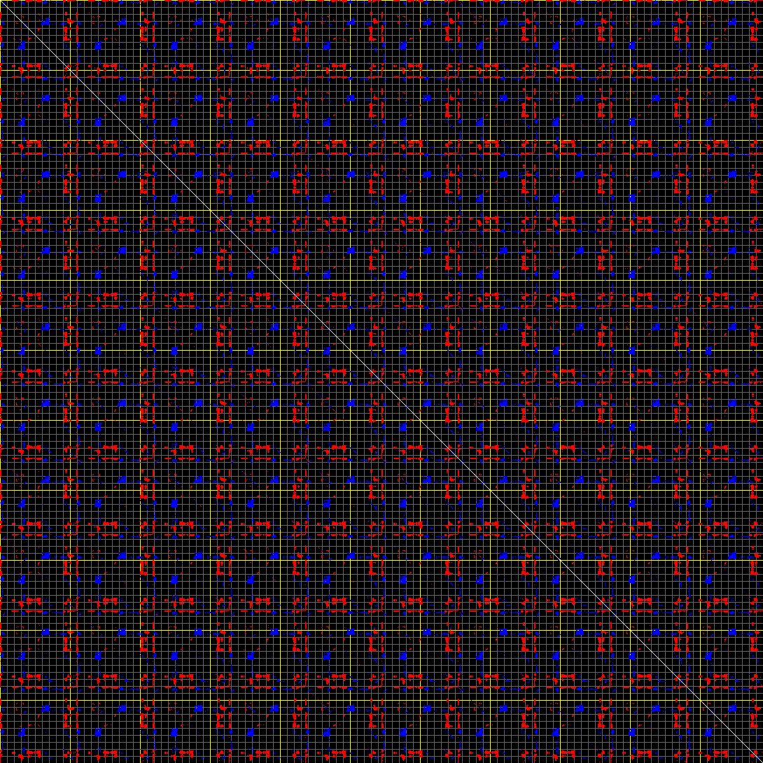 This matrix displays the maximum distance fluctuations between all pairs of CA atoms and between the two extreme conformations that were computed for this mode (DQMIN/DQMAX). Distance increases are plotted in blue and decreases in red for the strongest 10% of the residue pair distance changes. Every pixel corresponds to a single residue. Grey lines are drawn every 10 residues, yellow lines every 100 residues (counting from the upper left corner).
