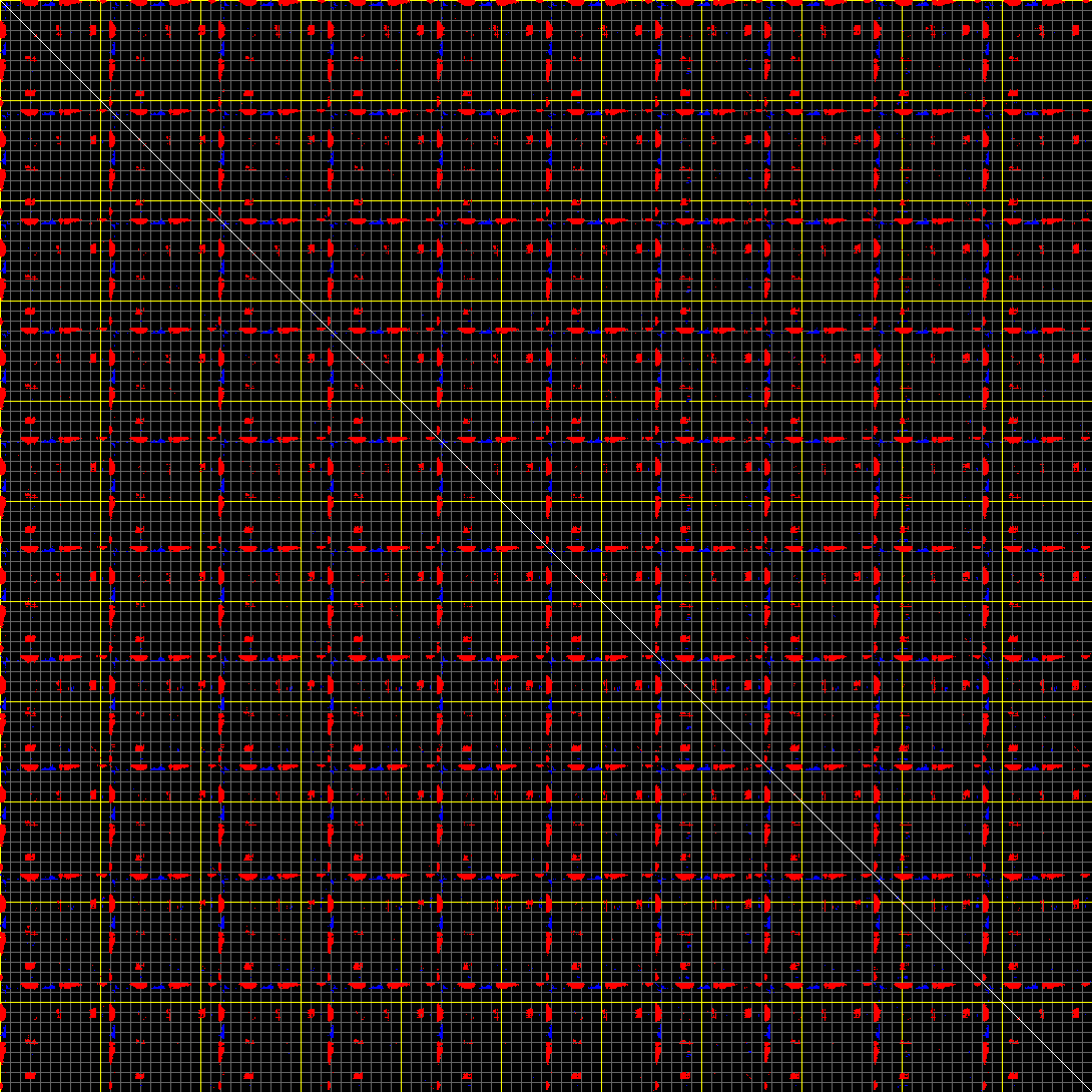This matrix displays the maximum distance fluctuations between all pairs of CA atoms and between the two extreme conformations that were computed for this mode (DQMIN/DQMAX). Distance increases are plotted in blue and decreases in red for the strongest 10% of the residue pair distance changes. Every pixel corresponds to a single residue. Grey lines are drawn every 10 residues, yellow lines every 100 residues (counting from the upper left corner).