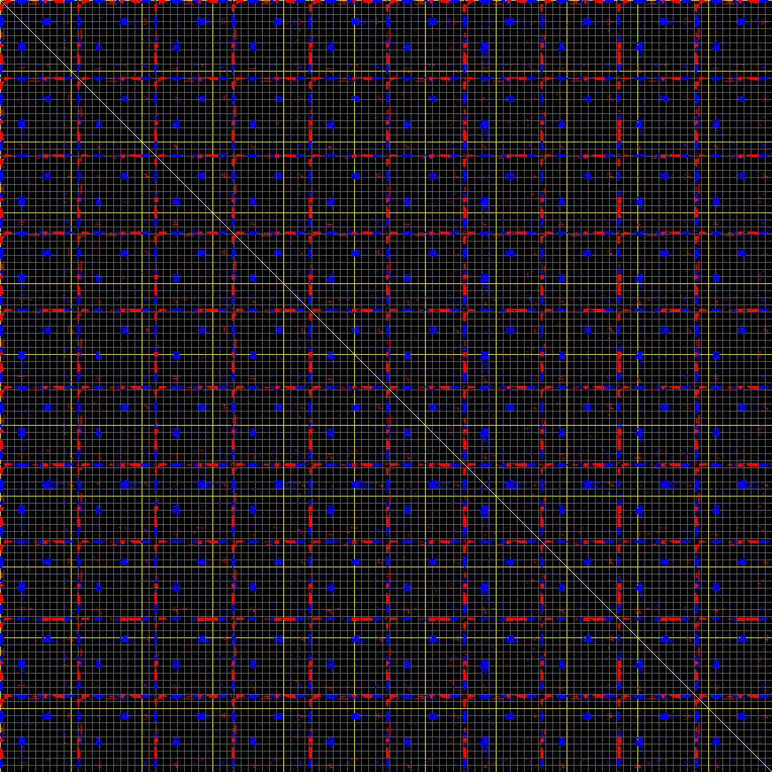 This matrix displays the maximum distance fluctuations between all pairs of CA atoms and between the two extreme conformations that were computed for this mode (DQMIN/DQMAX). Distance increases are plotted in blue and decreases in red for the strongest 10% of the residue pair distance changes. Every pixel corresponds to a single residue. Grey lines are drawn every 10 residues, yellow lines every 100 residues (counting from the upper left corner).