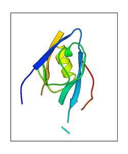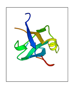 These views are prepared from three orthologuous viewpoints with MolScript. Secondary structures are determined from the C-alpha atom positions of your protein (N-terminal blue, C-terminal red).