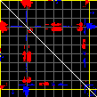 This matrix displays the maximum distance fluctuations between all pairs of CA atoms and between the two extreme conformations that were computed for this mode (DQMIN/DQMAX). Distance increases are plotted in blue and decreases in red for the strongest 10% of the residue pair distance changes. Every pixel corresponds to a single residue. Grey lines are drawn every 10 residues, yellow lines every 100 residues (counting from the upper left corner).