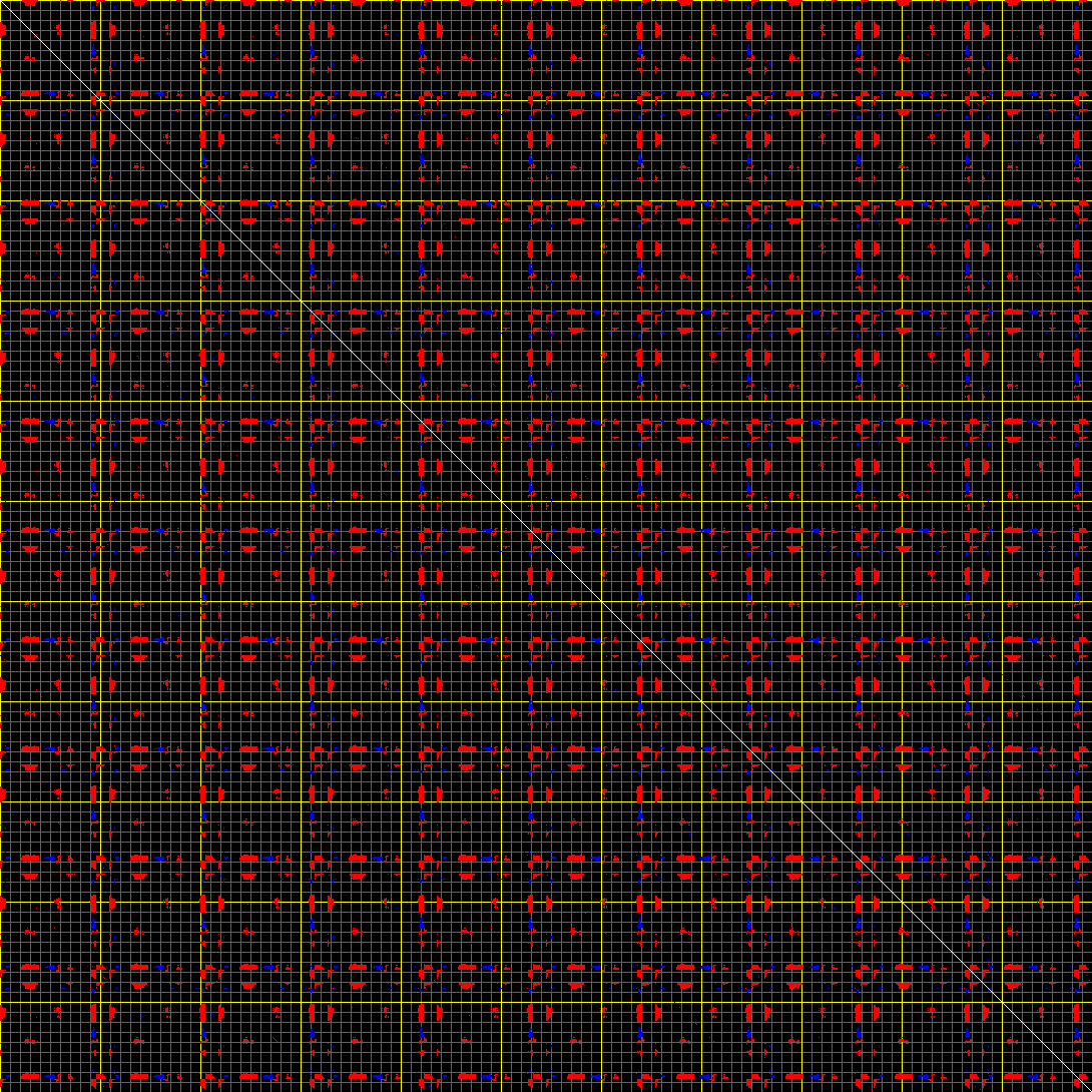 This matrix displays the maximum distance fluctuations between all pairs of CA atoms and between the two extreme conformations that were computed for this mode (DQMIN/DQMAX). Distance increases are plotted in blue and decreases in red for the strongest 10% of the residue pair distance changes. Every pixel corresponds to a single residue. Grey lines are drawn every 10 residues, yellow lines every 100 residues (counting from the upper left corner).