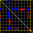 This matrix displays the maximum distance fluctuations between all pairs of CA atoms and between the two extreme conformations that were computed for this mode (DQMIN/DQMAX). Distance increases are plotted in blue and decreases in red for the strongest 10% of the residue pair distance changes. Every pixel corresponds to a single residue. Grey lines are drawn every 10 residues, yellow lines every 100 residues (counting from the upper left corner).