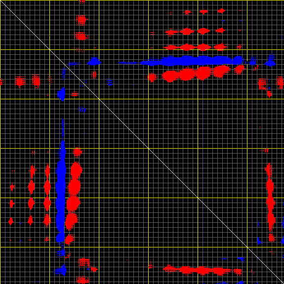This matrix displays the maximum distance fluctuations between all pairs of CA atoms and between the two extreme conformations that were computed for this mode (DQMIN/DQMAX). Distance increases are plotted in blue and decreases in red for the strongest 10% of the residue pair distance changes. Every pixel corresponds to a single residue. Grey lines are drawn every 10 residues, yellow lines every 100 residues (counting from the upper left corner).