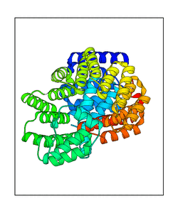 These views are prepared from three orthologuous viewpoints with MolScript. Secondary structures are determined from the C-alpha atom positions of your protein (N-terminal blue, C-terminal red).