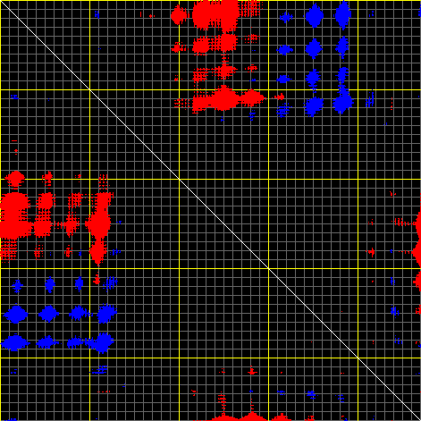 This matrix displays the maximum distance fluctuations between all pairs of CA atoms and between the two extreme conformations that were computed for this mode (DQMIN/DQMAX). Distance increases are plotted in blue and decreases in red for the strongest 10% of the residue pair distance changes. Every pixel corresponds to a single residue. Grey lines are drawn every 10 residues, yellow lines every 100 residues (counting from the upper left corner).