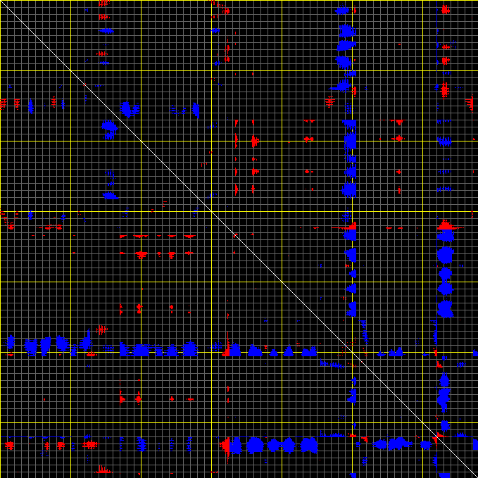 This matrix displays the maximum distance fluctuations between all pairs of CA atoms and between the two extreme conformations that were computed for this mode (DQMIN/DQMAX). Distance increases are plotted in blue and decreases in red for the strongest 10% of the residue pair distance changes. Every pixel corresponds to a single residue. Grey lines are drawn every 10 residues, yellow lines every 100 residues (counting from the upper left corner).