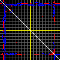 This matrix displays the maximum distance fluctuations between all pairs of CA atoms and between the two extreme conformations that were computed for this mode (DQMIN/DQMAX). Distance increases are plotted in blue and decreases in red for the strongest 10% of the residue pair distance changes. Every pixel corresponds to a single residue. Grey lines are drawn every 10 residues, yellow lines every 100 residues (counting from the upper left corner).