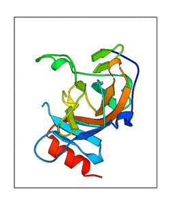 These views are prepared from three orthologuous viewpoints with MolScript. Secondary structures are determined from the C-alpha atom positions of your protein (N-terminal blue, C-terminal red).